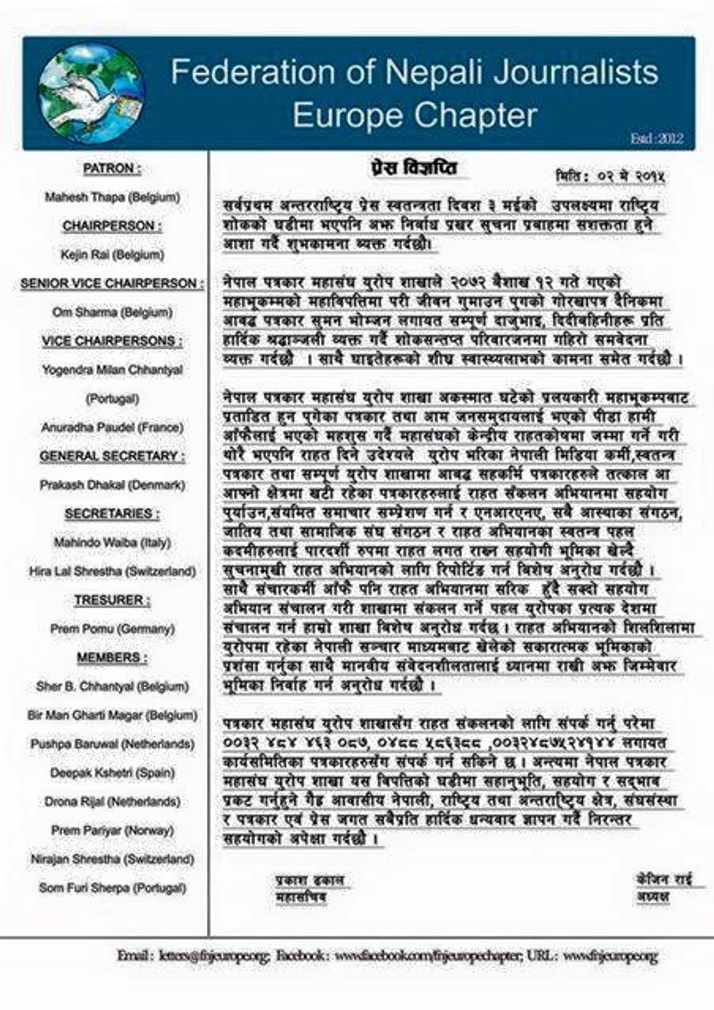 मिति ५ मे २०१५ मा नेपाल पत्रकार महासंघ यूरोपले निकालेको विज्ञप्ति
