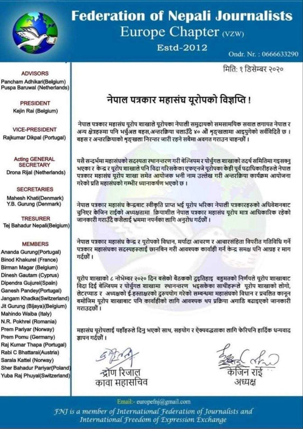 मिति १ डिसेम्बर २०२० मा नेपाल पत्रकार महासंघ यूरोपले निकालेको विज्ञप्ति