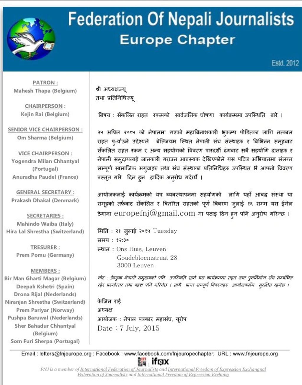 मिति ७ जुलाई २०१५ मा नेपाल पत्रकार महासंघ यूरोपले निकालेको विज्ञप्ति