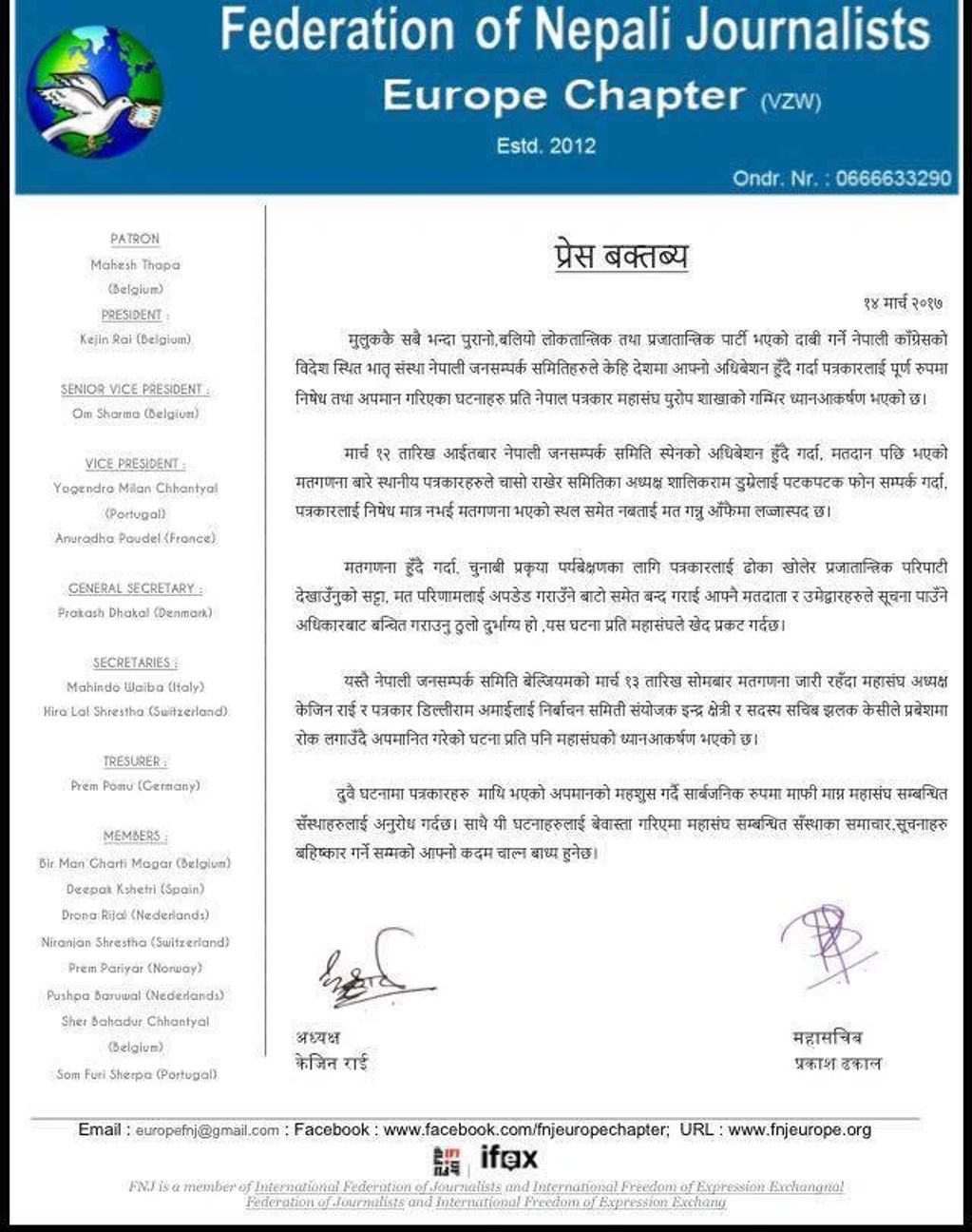 मिति १४ मार्च २०१७ मा नेपाल पत्रकार महासंघ यूरोपले निकालेको विज्ञप्ति