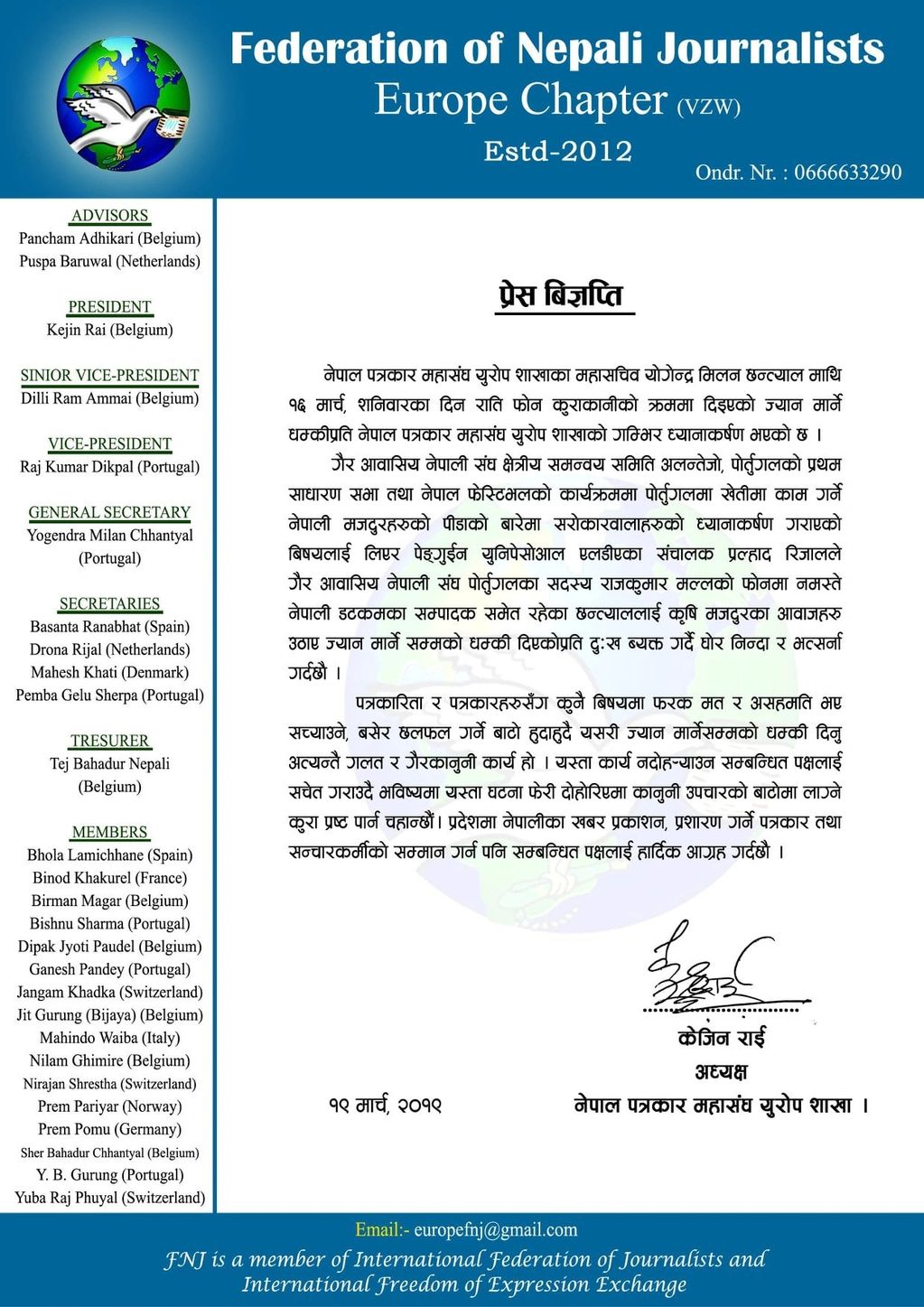 मिति १९ मार्च २०१९ मा नेपाल पत्रकार महासंघ यूरोपले निकालेको विज्ञप्ति