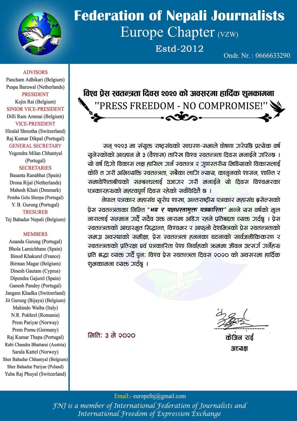 मिति ३ मे २०२० मा नेपाल पत्रकार महासंघ यूरोपले निकालेको विज्ञप्ति
