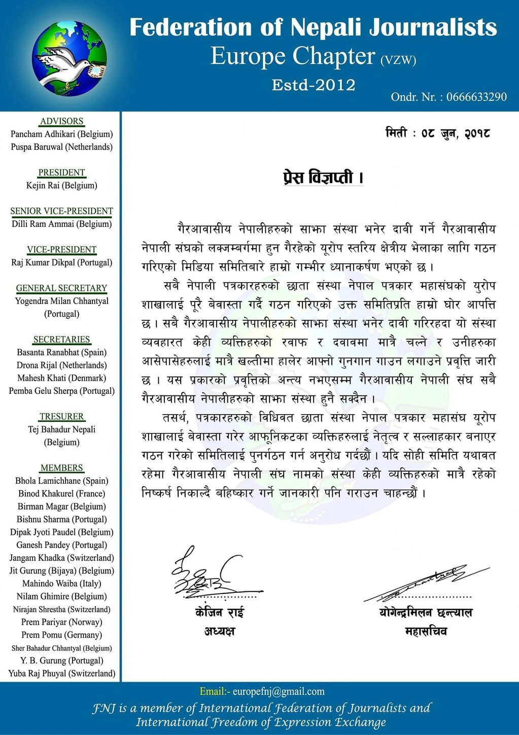 मिति ८ जुन २०१८ मा नेपाल पत्रकार महासंघ यूरोपले निकालेको विज्ञप्ति