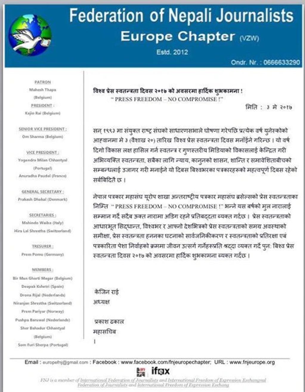 मिति ३ मे २०१७ मा नेपाल पत्रकार महासंघ यूरोपले निकालेको विज्ञप्ति