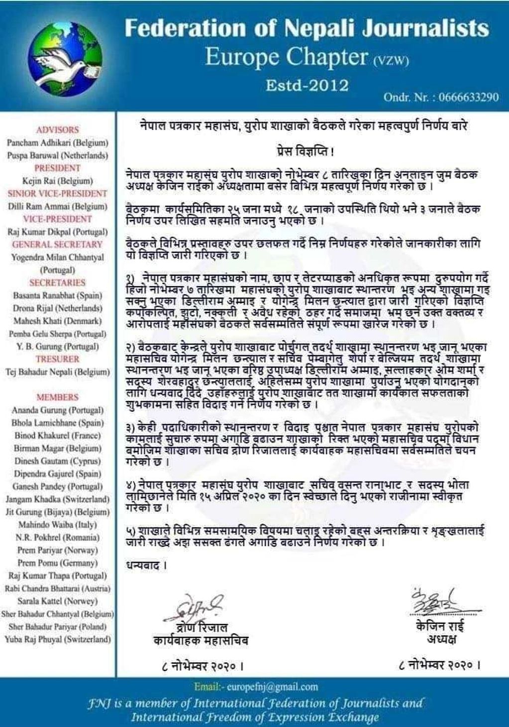 मिति ८ नोभेम्बर २०२० मा नेपाल पत्रकार महासंघ यूरोपले निकालेको विज्ञप्ति